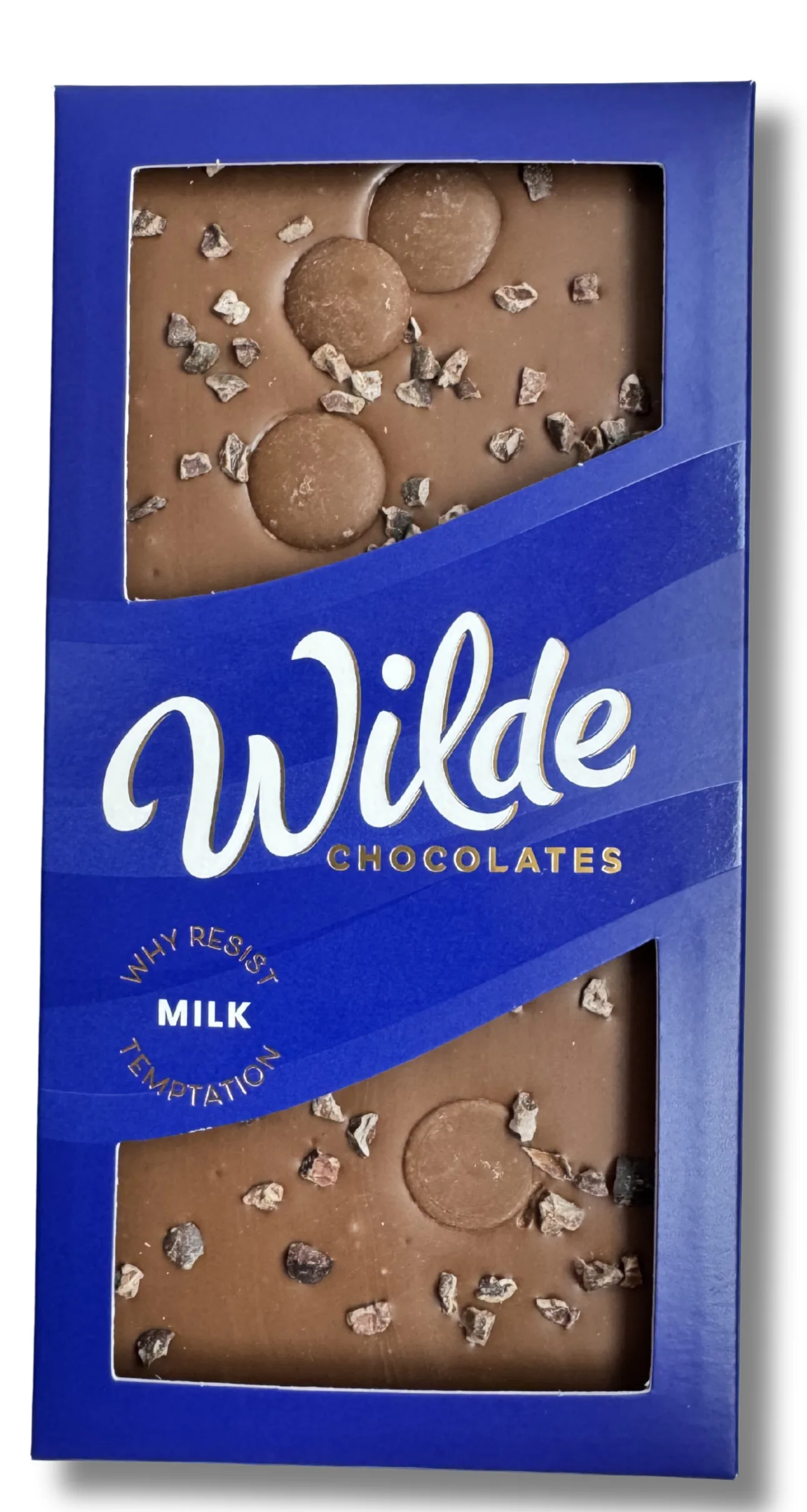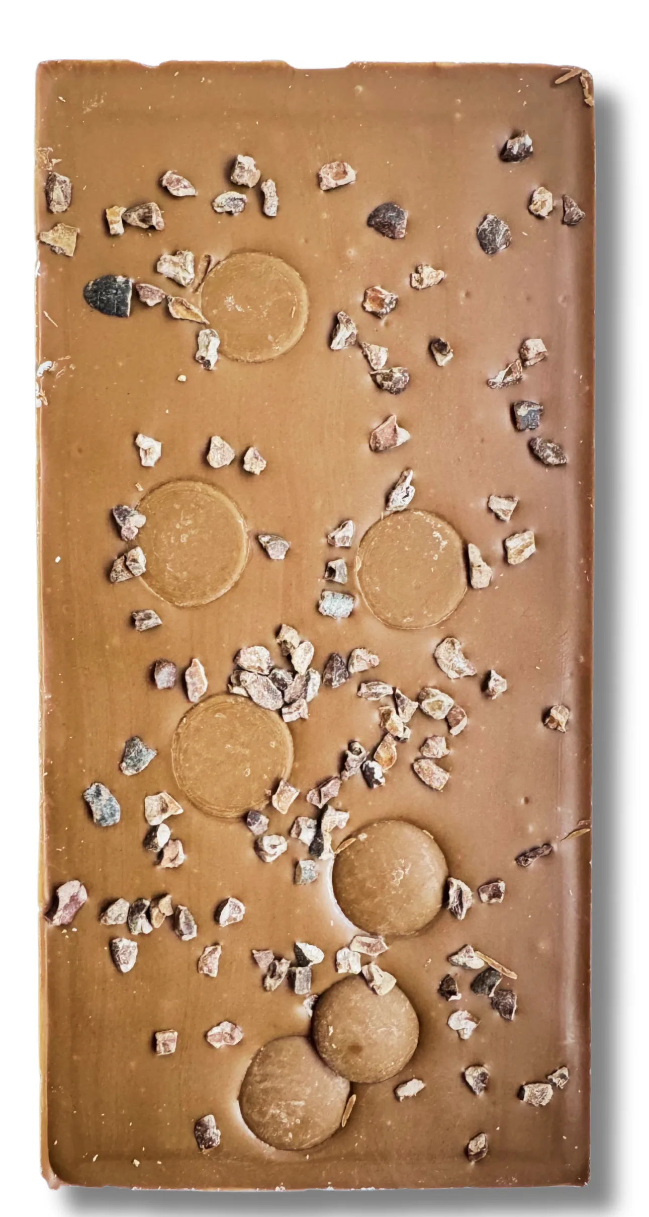 Crunchy cocoa bean nibs and sweet caramel drops liberally scattered on a bed of 33% cocoa solids milk chocolate.