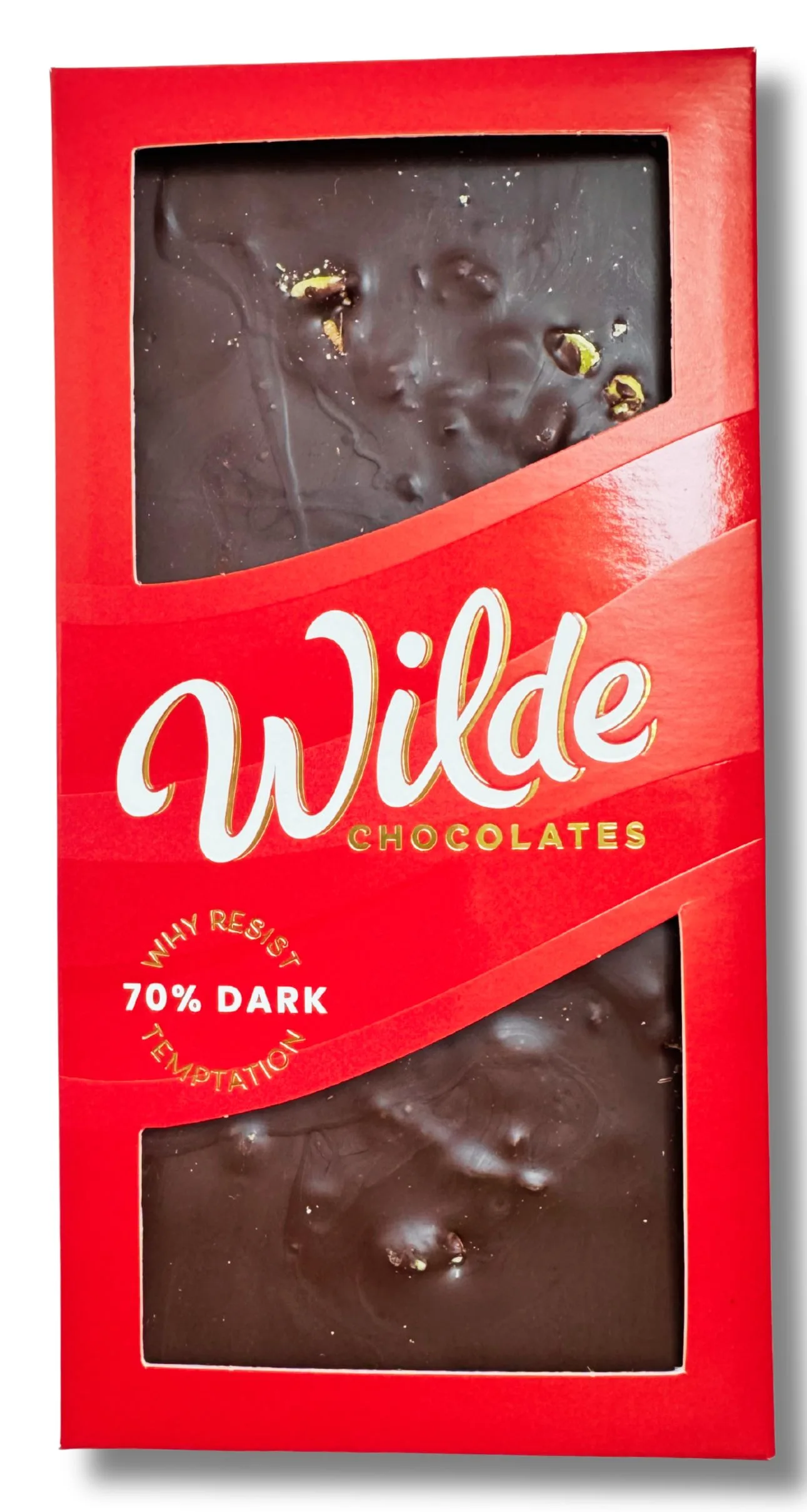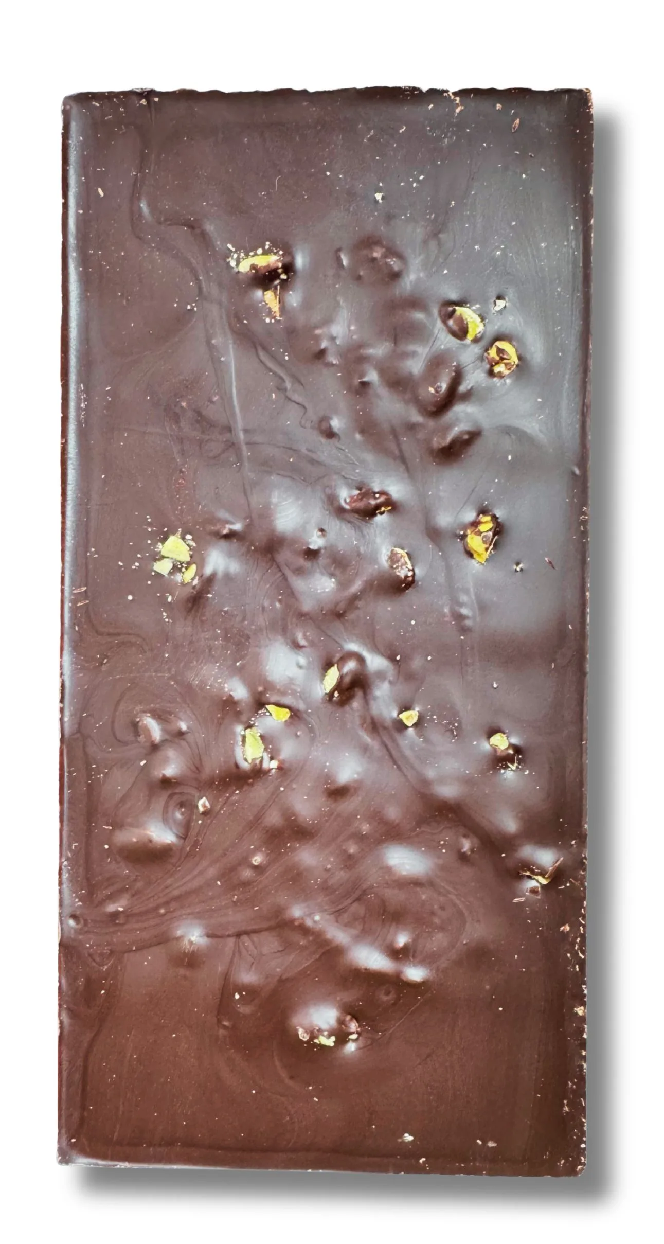 Discover the delight of pure dark chocolate, infused with crushed pistachios for a satisfyingly nutty experience. Made with 70% cocoa solids and vegan-friendly, it’s the perfect indulgence for chocolate and nut lovers. Enjoy the simple, pure pleasure in every bite. Handmade in small batches in our Co. Clare chocolate factory.